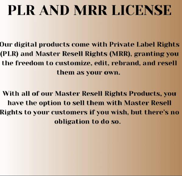Unlock expert strategies for self-love, personal growth, and passion with our transformative collection, including valuable workbook templates for guiding clients through mindfulness and breakthroughs. Perfect for personal transformation or growing your coaching business, this collection is a key to success. Plus, with Master Resell Rights (MRR) and Private Label Rights (PLR), you can modify, rebrand, and sell it as your own for potential earnings!